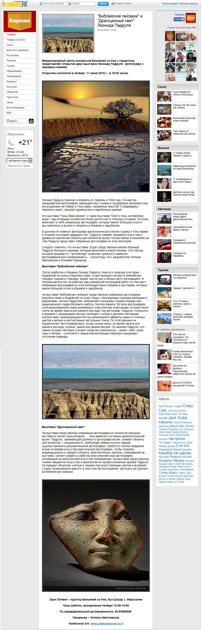 בנייני האומה גאה להציג: שתי תערוכות של הצלם לאוניד פדרול התערוכות:"אור יקרות" ו"נופים מקראיים" בתאריכים 11/06/2015 – 01/12/2015 כתובת - בנייני האומה, שדרות שז"ר 1, ירושלים שעות פתיחה בימים א'-ה' בין השעות 10:00-16:00 בתיאום מראש: 02-6558508 מרכז הקונגרסים הבינ"ל - בנייני האומה